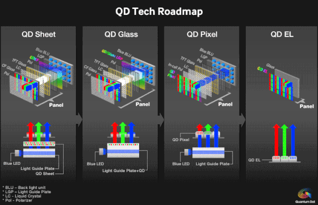 QLED 雖然同樣如 LCD 需依靠背光源,也承襲了其缺點,但透過量子點薄膜(QDEF)能發出更純的色彩。而三星近年來積極發展的 QD-OLED 則是更進一步,直接用藍色 OLED 光源,激發不同粒徑大小的量子點轉換成紅光和綠光。不僅性能提升,成本「理論」上也將低于原有的 WOLED 技術,加上噴墨印刷制程,有望使其產品能繼續稱霸市場。不過目前來看三星理想中的 QD-OLED 技術,由于光轉換率仍偏低,雖然近期不斷有樂觀消息傳出,但總體上商業化準備還不足。
